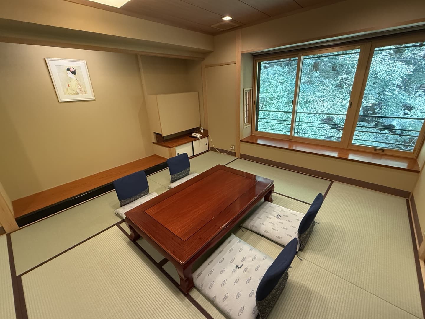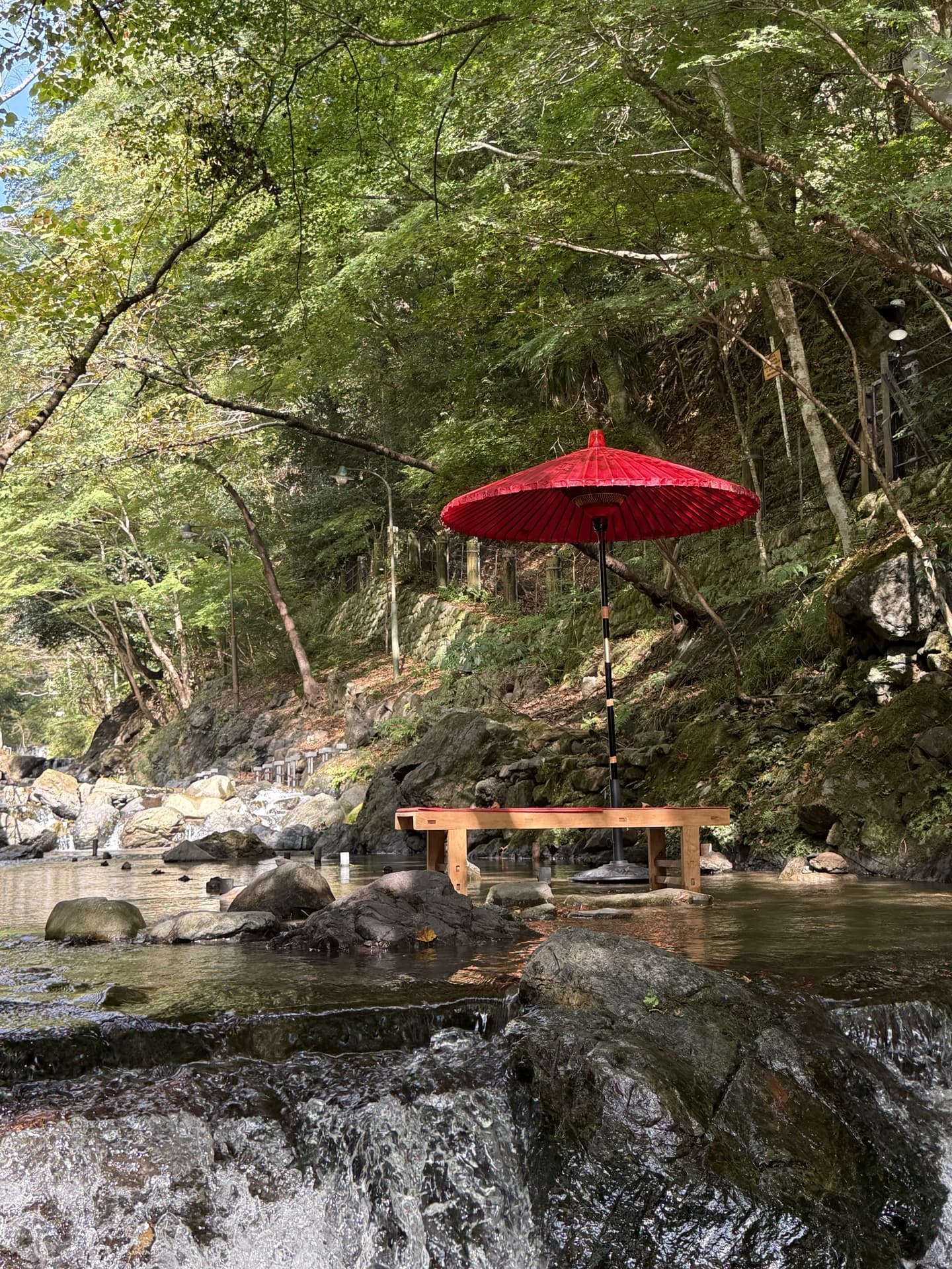 川床の季節が過ぎ、川でのお食事はできませんが川に椅子と傘を設置いたしました。写真などを撮っていただき楽しんでいただけましたら幸いでございます。